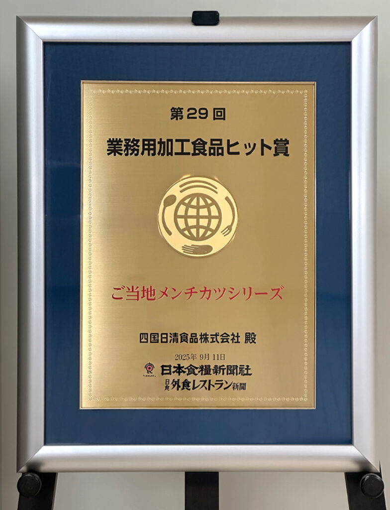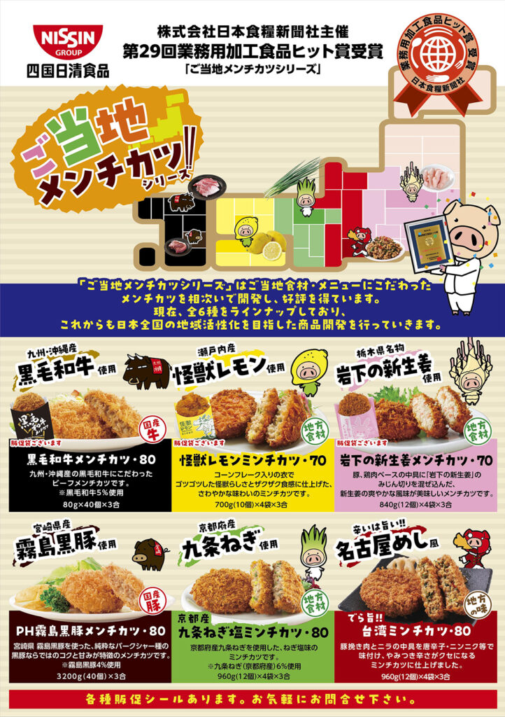 このたび四国日清食品の「ご当地メンチカツシリーズ」が、日本食糧新聞社制定の「第29回業務用加工食品ヒット賞」を受賞いたしました。